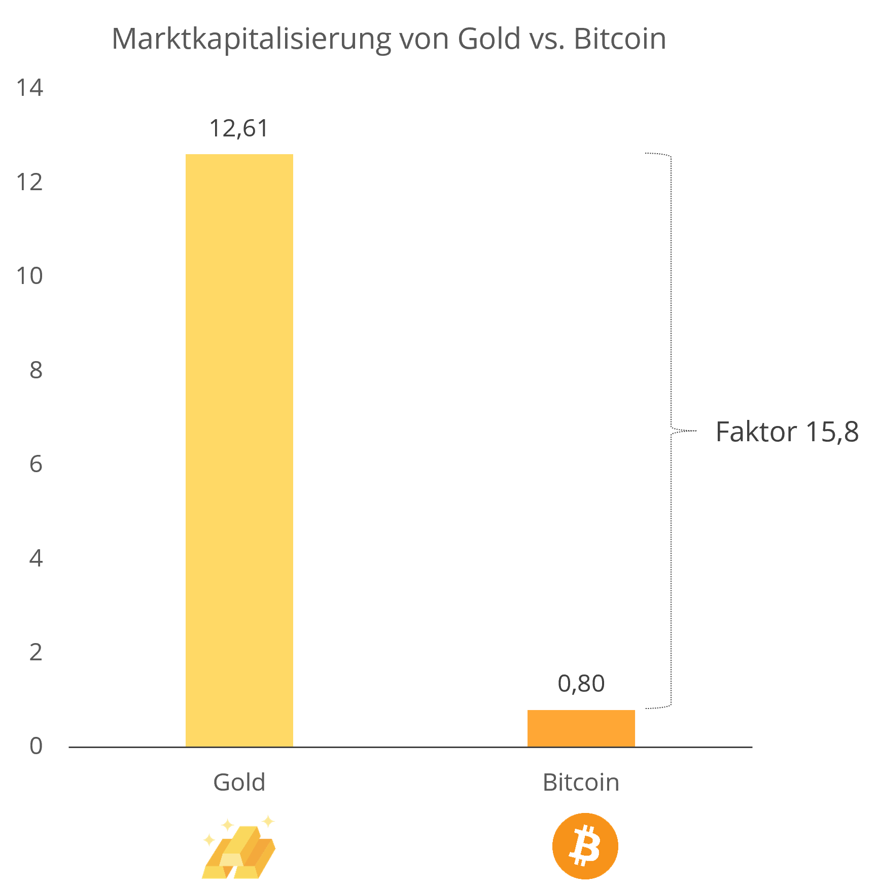 Marktkapitalisierung als Bewertungsmaßstab: Um die Marktbewertung von Bitcoin zu beurteilen, ist die Marktkapitalisierung wesentlich aussagekräftiger als der Preis pro Stück – sie beschreibt als Kenngröße den Gesamtwert aller im Umlauf befindlichen Anteile. Für Bitcoin beläuft sich diese bei einem unterstellten Preis von 40.000 € * 19,5 Million Stück auf ca. 780 Mrd €. Da Bitcoin als Rohstoff zu betrachten ist, liegt ein Vergleich mit der Marktkapitalisierung von Gold als Referenz nahe: Für Gold beläuft sie sich auf knapp 12,6 Billionen €, so dass sich der Bitcoin-Kurs knapp versechzehnfachen müsste, um den Börsenwert von Gold zu erreichen. In Anbetracht des Potenzials und den grundsätzlichen Vorteilen des Bitcoin-Netzwerks gegenüber Gold als hartes Geld (Link) wird das Kurspotenzial von Bitcoin als „digitales Goldes“ deutlich. Eine Gegenüberstellung mit weiteren klassischen Vermögenswerten wie etwa Aktien, Bonds oder Immobilien verdeutlicht den gegenwärtig noch sehr kleinen, erreichten Markt für Bitcoin – und unterstreicht das vorhandene Marktpotenzial, denn Bitcoin ist qua seinen Eigenschaften für alle angesprochenen Investorenkreise interessant.