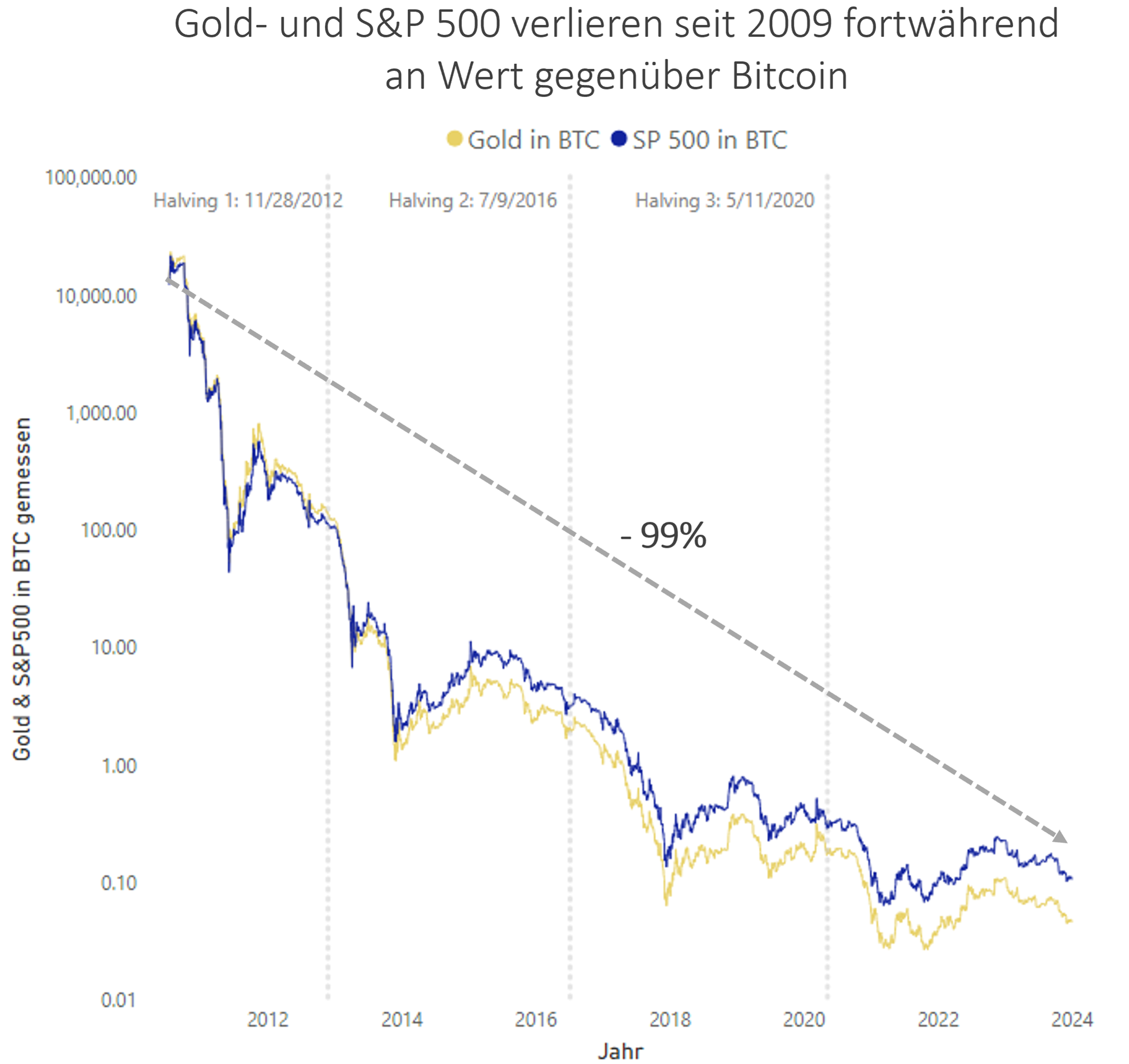 Die Überlegenheit von Bitcoin zeigt sich besonders deutlich, wenn man traditionelle Vermögenswerte in Bitcoin statt in US-Dollar umrechnet. Beide Referenzanlagen, Gold sowie der S&P 500-Index, haben gegenüber Bitcoin kontinuierlich an Wert verloren – seit 2011 eine Gesamtabwertung von nahezu 99%. Dies verdeutlicht den Erfolg von Bitcoin nicht nur als Anlageklasse, sondern auch als Wertaufbewahrungsmittel, da diese Entwicklung seit mehr als 10 Jahren kontinuierlich vonstatten geht.
