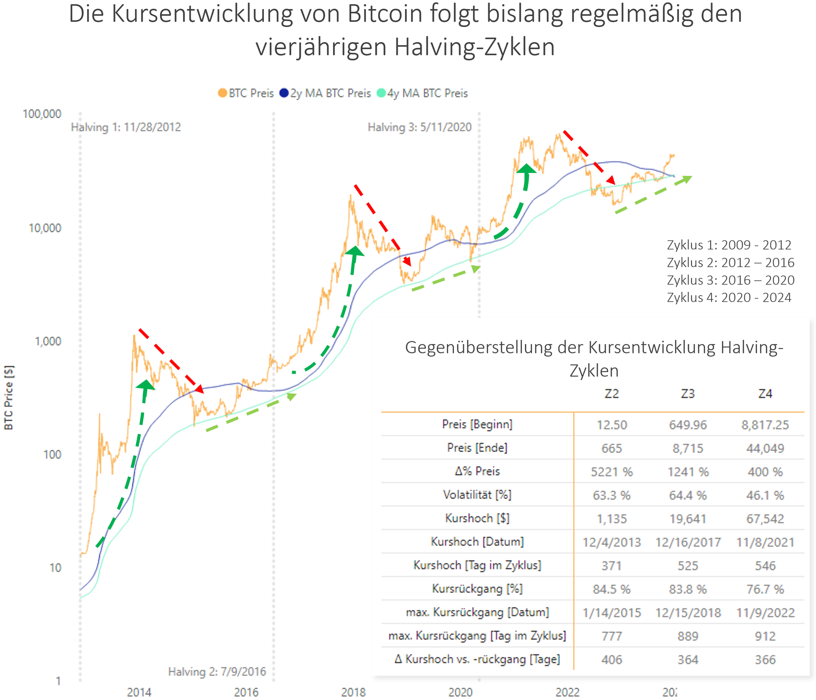 Historisch betrachtet zeichnen sich Investitionen in Bitcoin durch ein hohes Renditepotenzial aus, welches jedoch mit signifikanten Schwankungen einhergehen. So erfährt der Kurs in regelmäßigen Abständen Einbrüche von bis zu 80 % – erholt sich indessen vollständig von diesen Verlustphasen und erreicht neue Höchststände. Angesprochene Verlustphasen wirken jedoch abschreckend auf potenzielle Investoren und verleihen dem Bitcoin ein negatives Image eines hochspekulativen Glücksspiels, wenngleich eine differenzierte Betrachtung der Kursverläufe anzuraten ist. So gehen Assetklassen mit gemeinhin hohen Renditepotenzialen auch mit hoher Volatilität, also starken Kursschwankungen, einher. Dies ist auf klassische Investmentstrategien zurückzuführen, nach denen Investoren dazu neigen, Teile ihrer Gewinne auszuschütten, was nach starken Preissteigerungen zu Kurskorrekturen führt. Hierbei lassen sich für den Bitcoin-Kurs vierjährige Verlaufsmuster erkennen, welche aus marktpsychologischen Perspektive rational zu erklären sind.