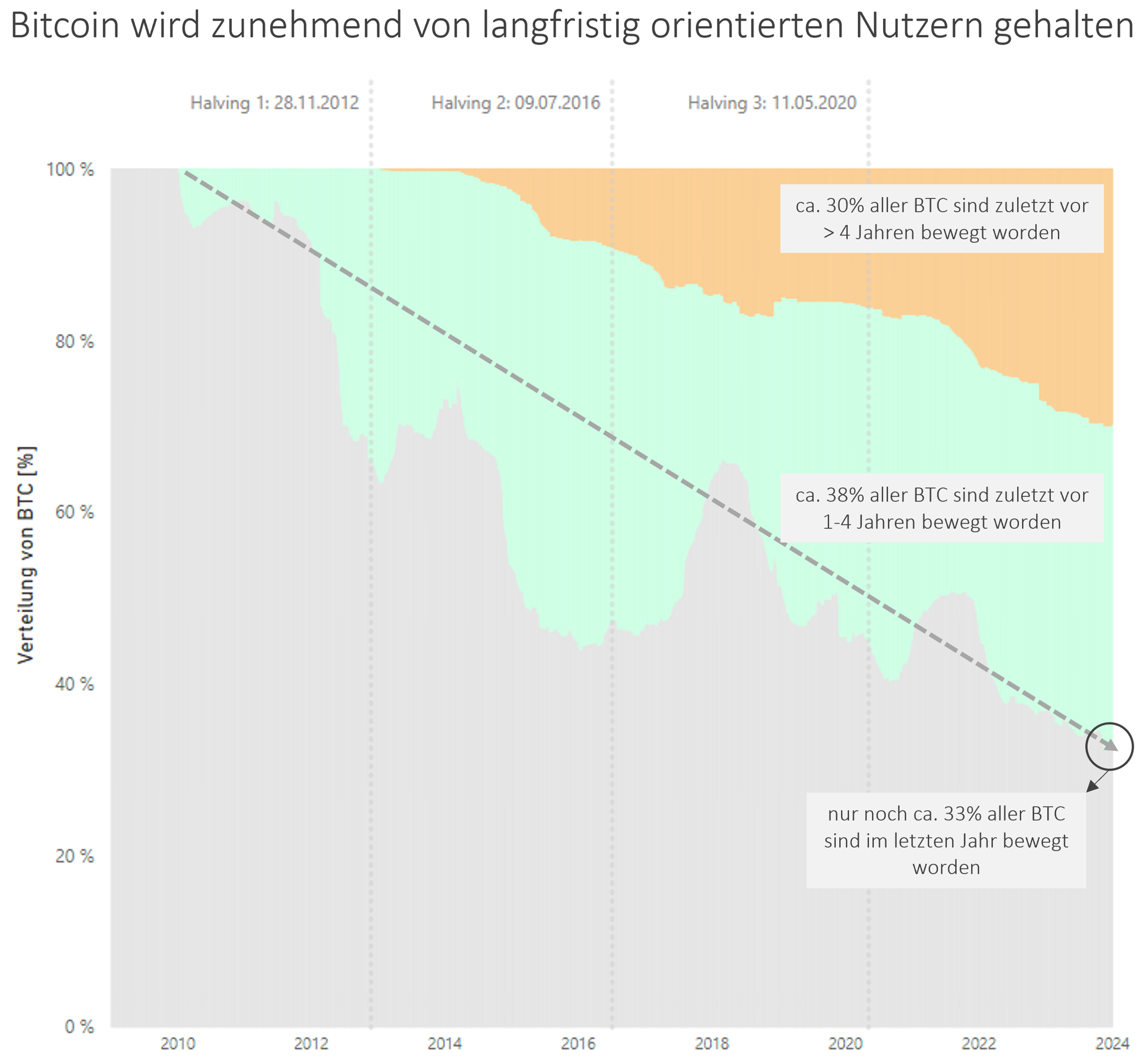 Langfristiges Angebots- und Nachfrageverhältnis: Aktuelle Daten zeigen eine kontinuierliche Entwickling dahingehend, dass Besitzer ihre Bitcoin vermehrt halten, was auf eine zunehmend langfristige Anlagestrategie hindeutet. Ebenso ist der Schluss zulässig, dass das Potenzial Bitcoins fortan erkannt wird, so dass entsprechende Verkaufsaktivitäten nachlassen. So wurden gegenwärtig (Stand: 12/2023) knapp 70% der gehaltenen Bitcoin seit über einem Jahr von ihren Besitzer nicht mehr bewegt, was ein Allzeithoch darstellt. Kombiniert mit der Angebotsverknappung durch die Halving-Events sowie einer zu erwartenden Nachfragesteigerung sind entsprechende Kursreaktionen zu antipizieren: Zukünftig verhandeln immer mehr interessierte Investoren um weniger zur Verfügung stehende Bitcoin – mit der Folge, dass die Bitcoin zu höheren Preisen gehandelt werden und der Kurswert an den Börsenplätzen weiter steigt.
