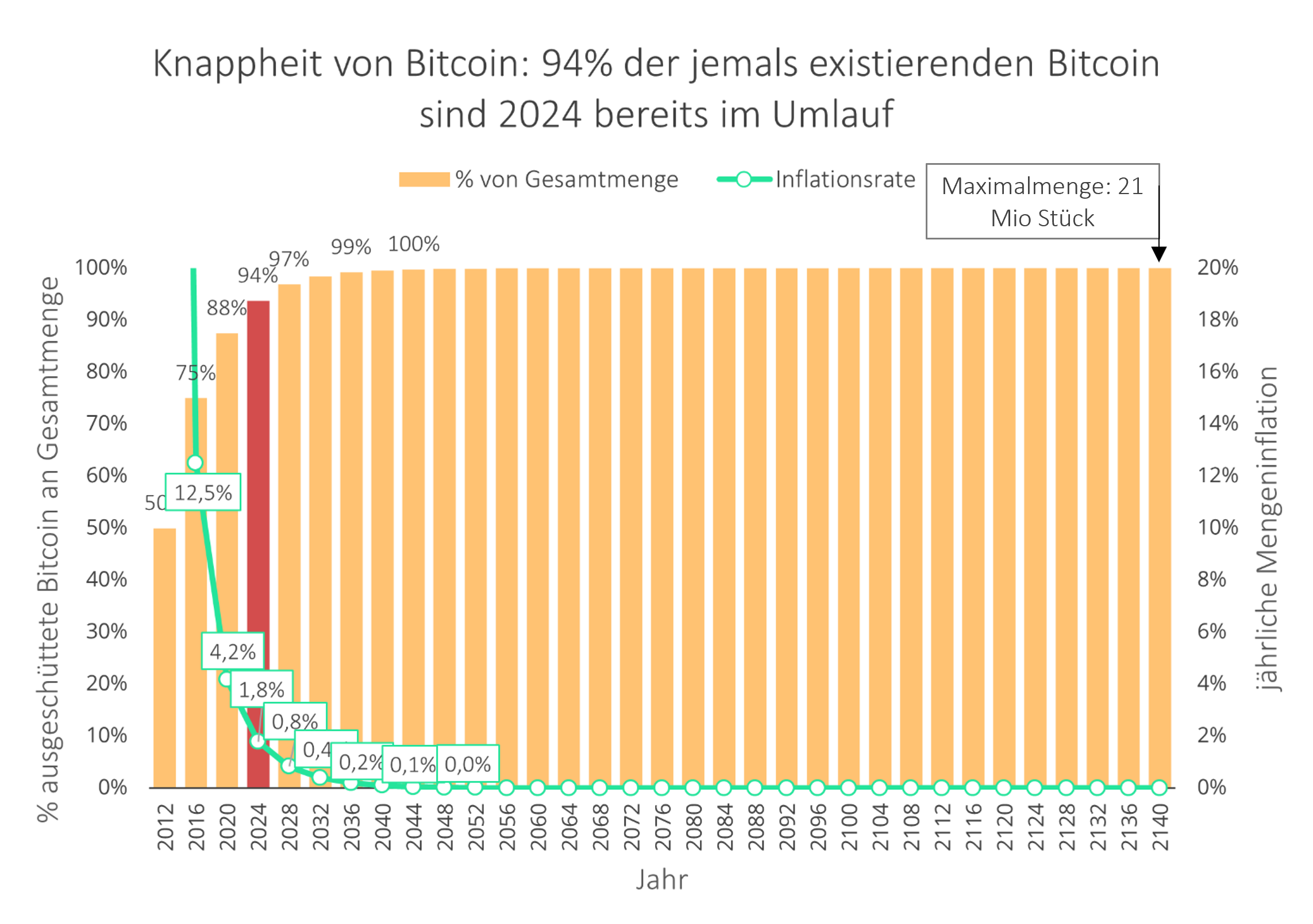 1. Die begrenzte Menge: Bitcoin ist ein Rohstoff, der nur unter einem hohen Arbeitsaufwand – mittels physischer Energie – gewonnen werden kann. Hierbei ist fest im Code von Bitcoin verankert, dass seine maximale Menge auf 21 Millionen Stück begrenzt ist. Diese beiden Merkmale macht Bitcoin zu einer seltenen Ressource, vergleichbar mit (digitalem) Gold. Beide sind knapp, aber Bitcoin hat den Vorteil, dass seine maximale Menge feststeht. Gold kann bei steigender Nachfrage in größeren Mengen gefördert werden, Bitcoin jedoch nicht. Es ist festgelegt, dass Bitcoin ab 2024 eine für immer niedrigere Neuschöpfungsrate als Gold haben wird – völlig unabhängig der Preisentwicklung. Dies erhöht seine Knappheit und implizit seinen Marktwert weiter – und macht Bitcoin hierdurch noch einmal wesentlich begrenzter als Gold.