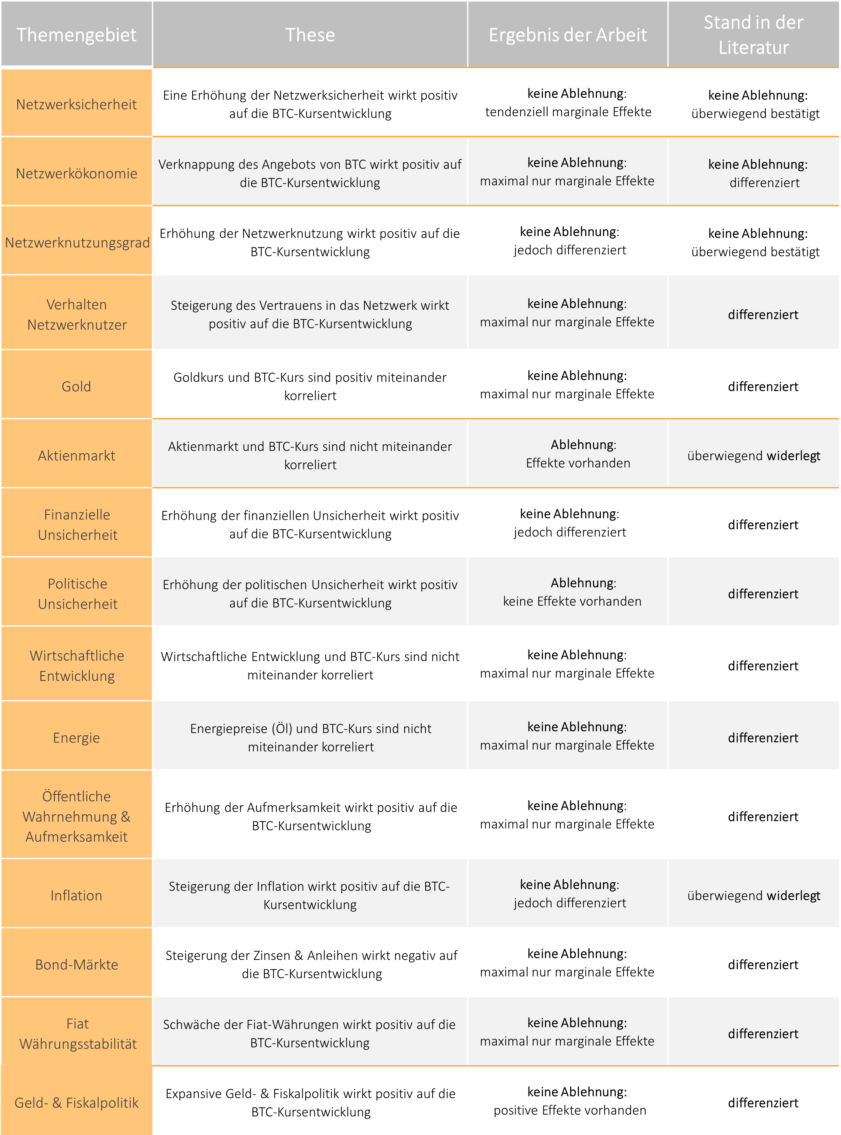 Makroökonomische Einflüsse: Bitcoin wird von makroökonomischen Faktoren beeinflusst, wie sie auf Finanz- und Aktienmärkten wirken. Dazu gehört neben wirtschaftlichen Indikatoren vor allem die Geld- und Fiskalpolitik: Es zeigt sich, dass Bitcoin – erfunden als Lösungsalternative für die Problematiken des heutigen Geldsystems – durch die expansive Geldpolitik positiv beeinflusst wird, so dass Bitcoins Schutzfunktion vor der systematischen Vermögenswertinflation als bestätigt anzusehen ist.