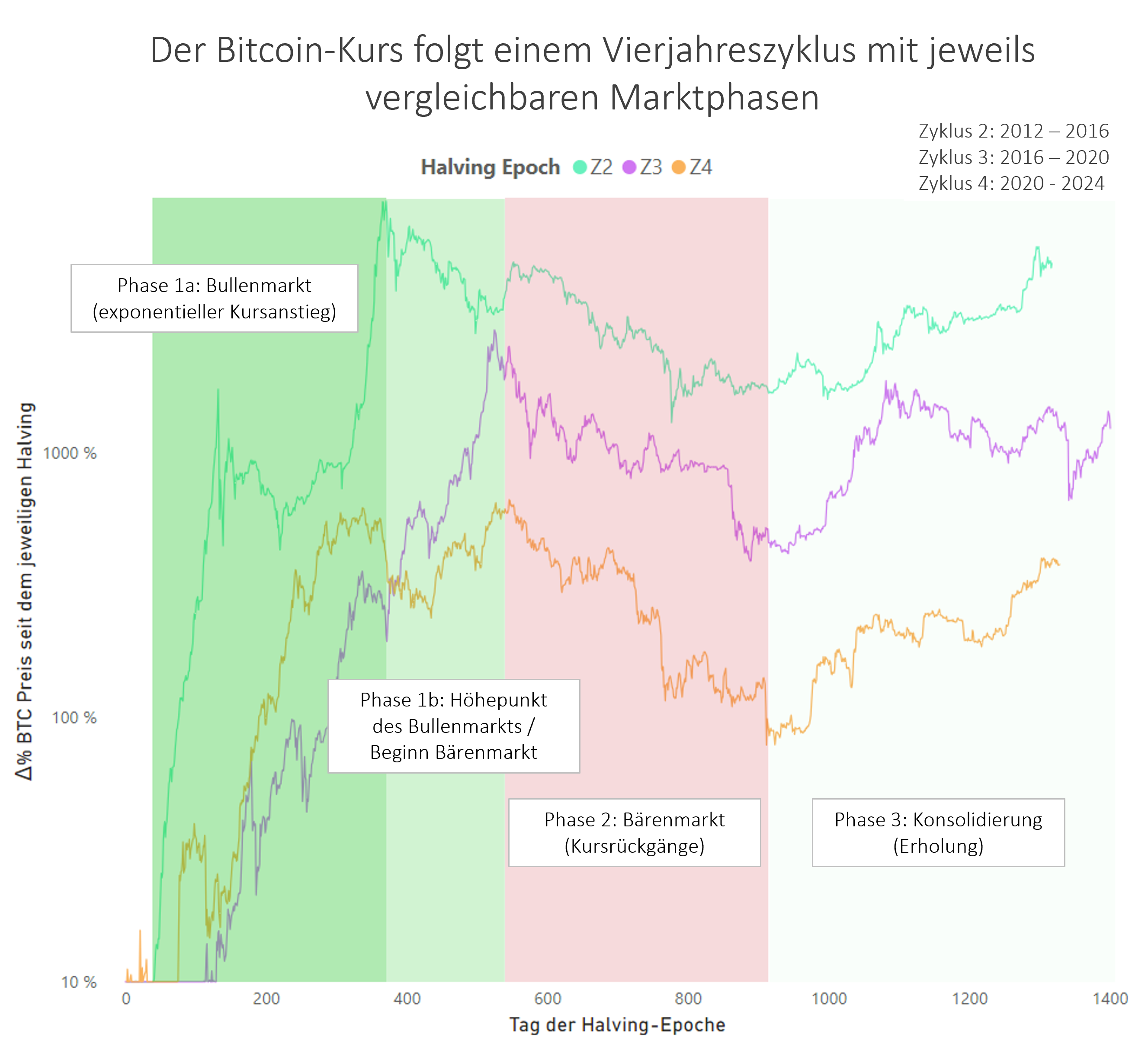 Hierbei folgt der Bitcoin-Kurs einem Vierjahresmuster, nach dem exponentielle Kursanstiege in den Jahren 2013, 2017 sowie 2020/21 in starken Verlustjahren 2014, 2018 sowie 2022 mündeten, infolgedessen eine Konsolidierungsphase in den folgenden Zyklus führt. Interessanterweise stehen diese Zyklen im direkten zeitlichen Zusammenhang mit den ‚Halving-Events‚, bei denen die Belohnung für das Mining halbiert wird, was die Neuschöpfungsrate (Inflation) von Bitcoin verlangsamt und den Preis durch eine Angebotsverknappung beeinflusst. Die Stärke der Kursausschläge ist letztlich damit zu beründen, dass durch mediale Überhöhung (Hype) irrationale Kursanstiege angefacht werden, welche in vorübergehenden Preisblasen münden, die im Anschluss korrigiert werden. Es ist festzuhalten, dass iIm Ergebnis dieser Vierjahreszyklik bislang ausnahmslos deutliche Kursgewinne zu Buche stehen. Kurzfristige Kursverluste sollten daher nicht als fundamentaler Wertverlust gesehen werden, sondern sind eher Ausdruck von Marktstimmungen und Spekulationsverhalten.