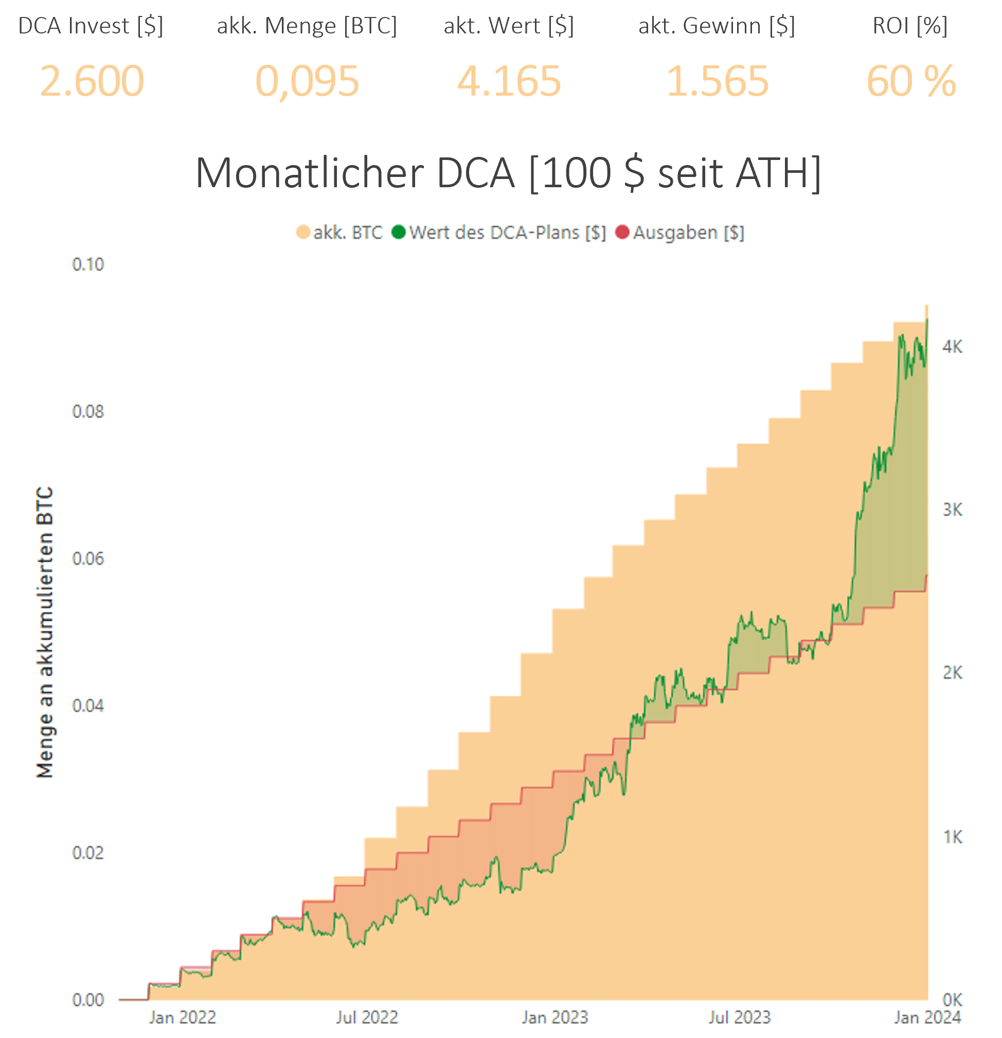 Ein praktisches Beispiel: Nehmen wir an, Sie hätten seit dem 15. November 2021 (als der Bitcoin-Kurs bei 58.000 Euro lag) monatlich 100 Euro investiert. Trotz des Kursverfalls auf zwischenzeitlich 15.000 Euro im November 2022 und einem Kurs von 40.000 Euro am 7. Dezember 2023, welcher noch immer deutlich unter dem Einstiegspreis liegt, erzielt dieser DCA eine Rendite von 38% erzielt. An diesem Beispiel zeigt sich der Vorteil eines DCA: Während