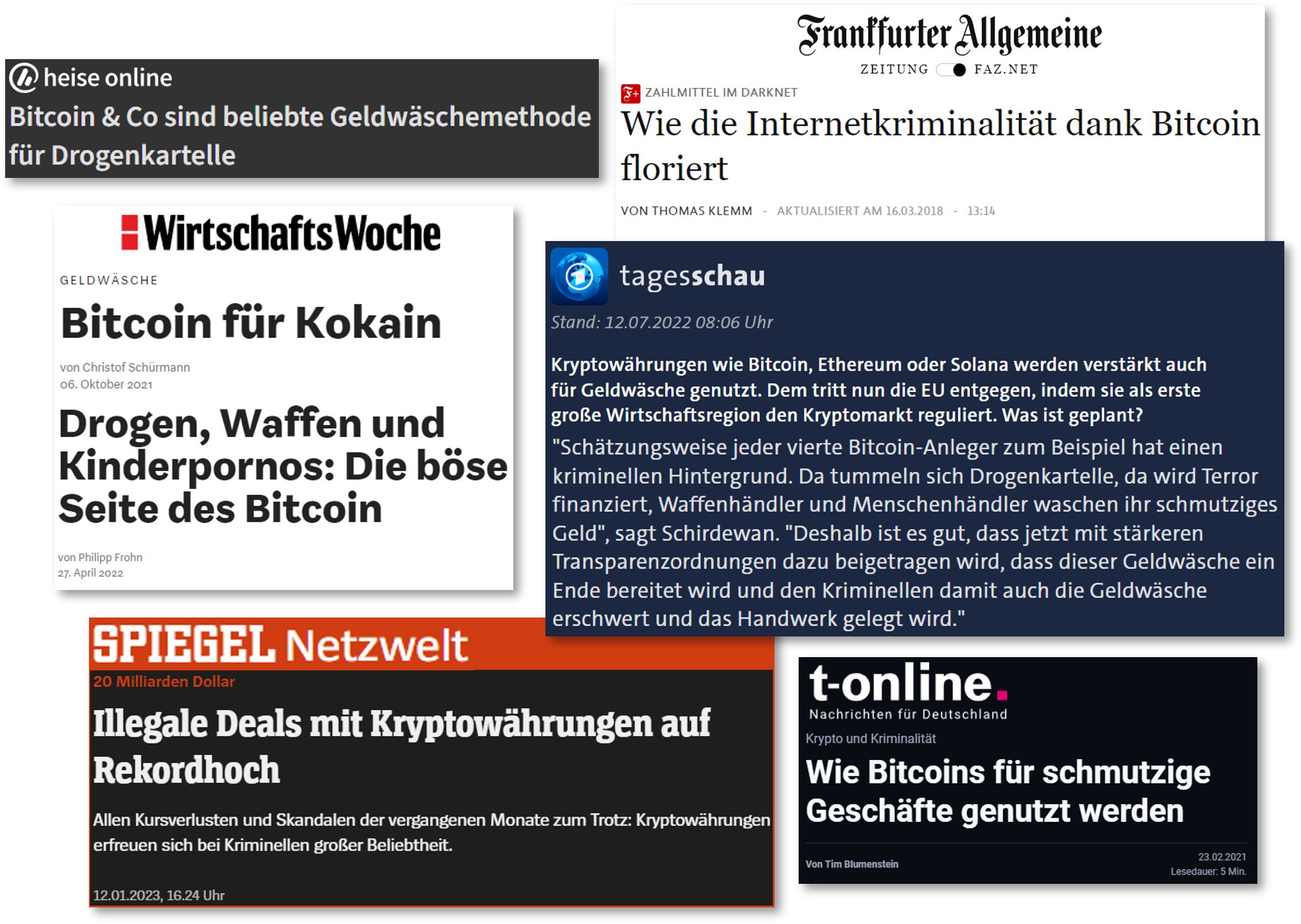 Als Fazit ist festzuhalten, dass sowohl auf Basis rationaler Ableitungen aus den Charakteristika von Bitcoin als auch entsprechende Datenanalysen der Vorwurf des Förderns krimineller Handlungen eindeutig zu widerlegen ist. Es zeigt sich, dass mangelndes Wissen über die Eigenschaften der Blockchain-Technologie, welche explizit Pseudonymität und keine Anonymität der Teilnehmer schafft, zu entsprechenden Fehlschlüssen über die Sinnhaftigkeit einer Bitcoin-Nutzung für kriminelle Handlungen führen. Zusätzlich sind der Berichterstattung tendenziöse Meinungsmache zu unterstellen, indem etwa jährliche Volumina nicht in das Verhältnis zu den steigenden Gesamtvolumina im Kryptobereich gesetzt werden, so dass rückläufige Anteile krimineller Handlungen nicht als solche deklariert werden. Des Weiteren ist anzumerken, dass innerhalb krimineller Aktivitäten unterschieden werden sollte, ob das Bitcoin-Netzwerk bewusst zur Verschleierung einer Straftat genutzt wurde oder es sich um kriminelle Transaktionen handelte, die im Bitcoin-Netzwerk abgelaufen sind, ohne dass die kriminelle Handlung jedoch direkt mit dem Bitcoin-Netzwerk zu tun hat – etwa bei betrügerischen Dienstleistern wie bei den spektakulären Fällen der Kryptobörsen FTX und Binance.