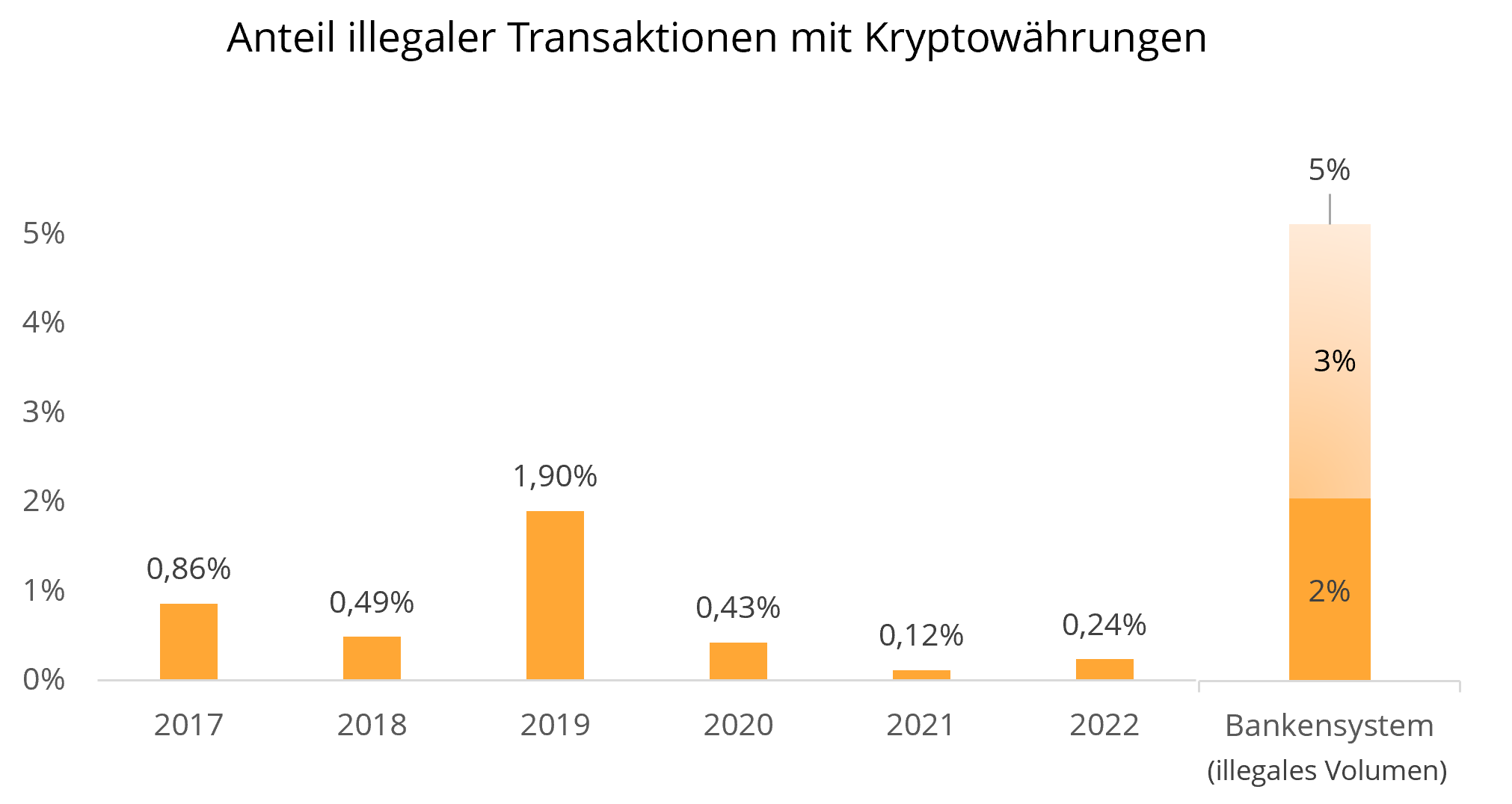 Diese Gegebenheiten sind auch auf Basis aktueller Daten zu bestätigen, wenngleich die Zahlen medial anders gedeutet werden: Für eine sachliche Einordnung des in den Medien berichteten „Rekordhochs“, wonach im Kryptobereich insgesamt 20 Mrd $ in 2022 illegal transferiert wurden, ist festzuhalten, dass hiermit lediglich 0,24 % aller Transaktionen im Kryptobereich als illegal einzustufen waren. Ein direkter Vergleich mit dem klassischen Bankensystem ist aufgrund mangelnder Daten nicht möglich, dennoch sprechen Schätzungen über ein illegales Transaktionsvolumen von 2-5% des weltweiten BIP eindeutig dafür, dass die kriminellen im Kryptobereich gewiss nicht als überdurchschnittlich zu bewerten sind. Diese Beobachtung ist letztlich aufgrund der Transparenz und Unveränderlichkeit der Blockchain folgerichtig und geht etwa auch mit den Darlegungen des Ex-CIA Chefs Michael Morrel einher.