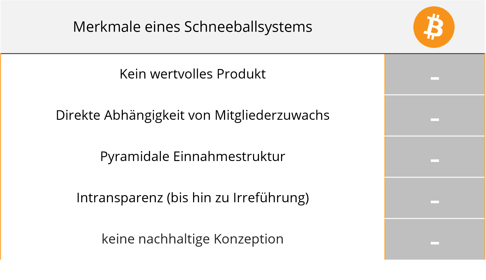 Es ist festzuhalten, dass Bitcoin keines der Merkmale von klassischen Schneeballsystemen aufweist, sondern aufgrund der Transparenz und Dezentratlität komplett gegensätzliche Eigenschaften vereint. So kann Bitcoin auch kein Ponzi-Scheme – einer dem Schneeballsystem ähnlichen Betrugsmasche – darstellen, weil es im Netzwerk schlichtweg keine Intransparenz und zentralen Akteure gibt, welche betrügerische Aktivitäten mit den Beständen oder Investitionen auf der Blockchain ermöglichen würden. Die diskutierten Vorbehalte und Unterstellungen gegen Bitcoin zeigen, wie wenig Verständnis über das Bitcoin-Netzwerk gegenwärtig vorliegt – und dringend notwendig entsprechende Bildung ist.