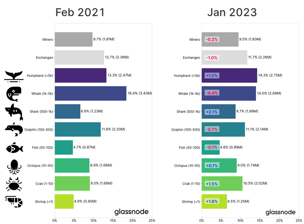 Da die Blockchain öffentlich einsehbar ist, sind auch die Bestände aller einzelnen Bitcoin-Adressen zu analysieren. Es muss jedoch berücksichtigt werden, dass bestimmte Adressen – insbesondere jene mit hohen Beständen – als Sammeladressen bestimmter Services und Entitäten, wie etwa den Kryptobörsen und Minern fungieren. Aus diesem Grund werden nachfolgend die Daten von Glassnode, einem der führenden Blockchain-Analyse Unternehmen, hinzugezogen, welche entsprechende Adresszuordnungen in ihren Verteilungsanalysen separiert. Die Daten für Januar 2023 zeigen, dass 6,5% aller Bitcoins von Adressen (vereinfacht: Nutzer) gehalten werden, welche weniger als 1 Bitcoin besitzen. Knapp 30% aller Bitcoins werden demnach von Nutzern gehalten, die bis zu 100 Bitcoin halten. Demgegenüber stehen wiederum knapp 30% aller Bitcoins, die von sehr großten Bitcoin-Eigentümer (>1.000 Bitcoin) gehalten werden. Es gilt jedoch die Einschränkung zu beachten, dass eine detailliertere Unterteilung nach Unternehmen, Staaten, Verwahrer und weiteren Entititäten vs. Privatleute