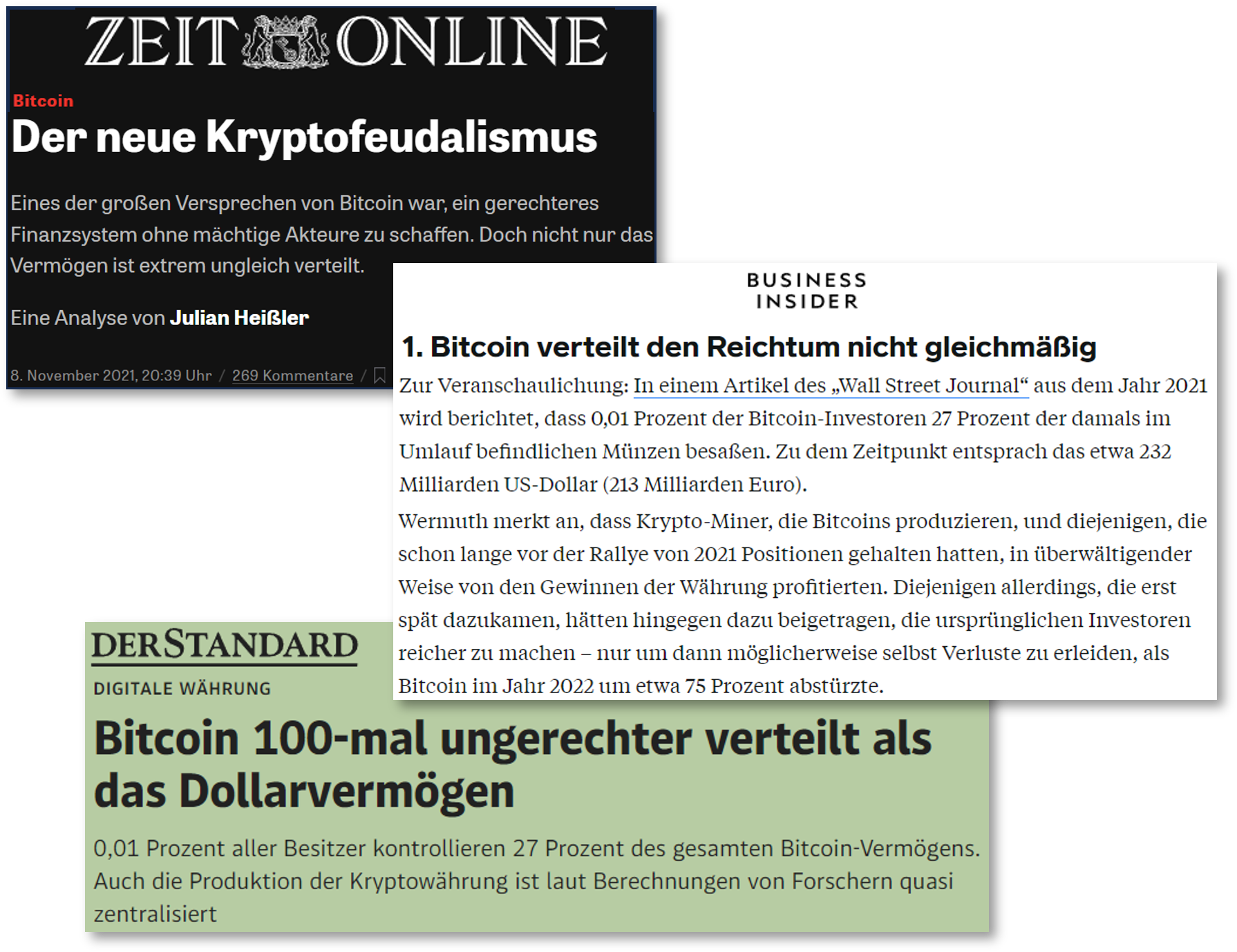 Mit der rasanten Preisentwicklung von Bitcoin in den vergangenen 14 Jahren gehen auch enorme Wertsteigerungen von Bitcoin-Haltern einher, welche frühzeitig investiert haben: Eine Investition in 100 Bitcoin für insgesamt 40.000 € im Frühjahr 2016 wären nach heutigem Stand (12/2023) 40 Mio € wert. Durch die sehr niedrigen Preise in den Anfangsjahren kommt es dazu, dass sich gegenwärtig ein hoher Anteil der Gesamtmenge Bitcoins auf verhältnismäßig wenigen Adressen (Konten = Nutzer) konzentriert. Medial wird hieraus häufig abgeleitet, dass Bitcoin ungleich verteilt sei und aus diesem Grund kein sozial „gerechtes Finanzsystem ohne mächtige Akteure“ darstellen könne. Zusätzlich wird eine starke Miningkonzentration auf einige wenige Miner angeführt, wodurch sich die Verteilung neu geschaffener Bitcoin ebenfalls auf einige wenige Parteien konzentriere.