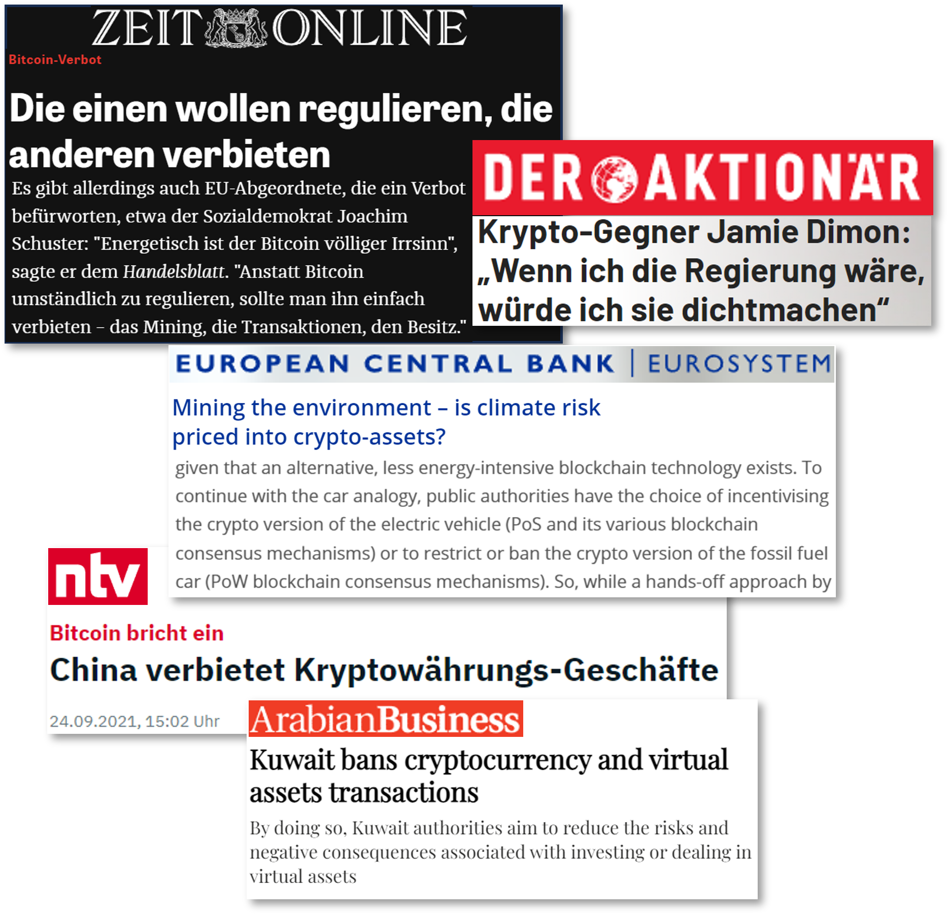 Ein häufig hervorgebrachter Kritikpunkt am Zukunftspotenzial und der Marktbewertung von Bitcoin stellt das Risiko eines Verbots dar: Demnach würde Bitcoin, sofern es tatsächlich anschicken würde, als dezentrales Geldsystem die Macht zentraler Entitäten wie Zentralbanken und Regierungen zu erodieren, schlichtweg verboten werden. Entsprechende Befürwörter und Bestrebungen für ein Verbot gibt es nahezu weltweit – hierbei werden zumeist Umweltbedenken aufgrund des Proof-of-Work Mechanismus (warum Bitcoin kein Klimakiller ist) oder einer vermeintlichen Unterstützung krimineller Handlungen (warum Bitcoin dies nicht tut) angeführt. Abhängig von den konkreten Vorbehalten umfassen Verbotsanstrengungen hierbei zumeist das Mining und/oder sogar der Besitz, das Handeln und Transferieren von Bitcoin.